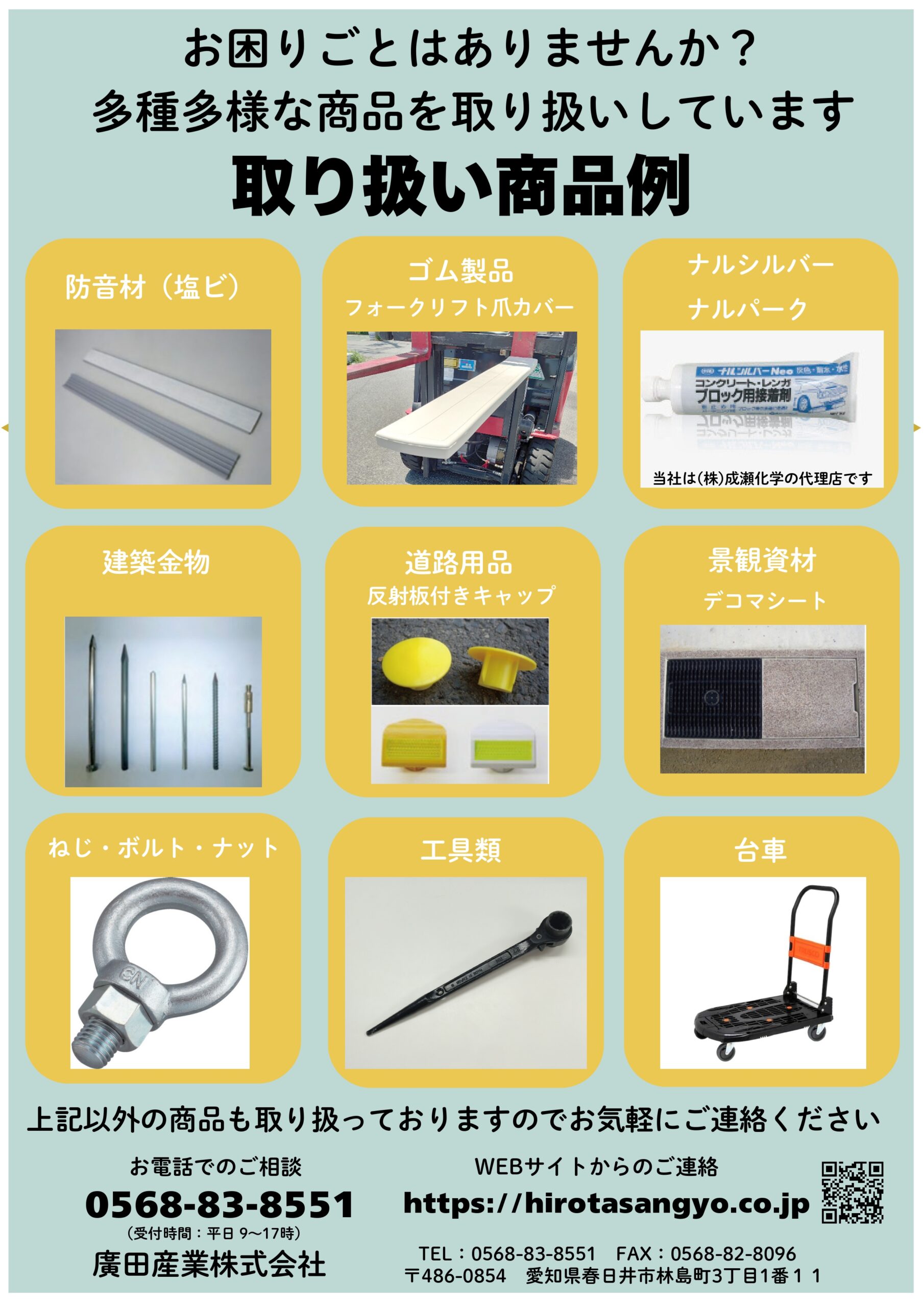 コンクリート二次製品、土木工事、工場内などで様々な現場で、多種多様な商品を取り扱いしております。
